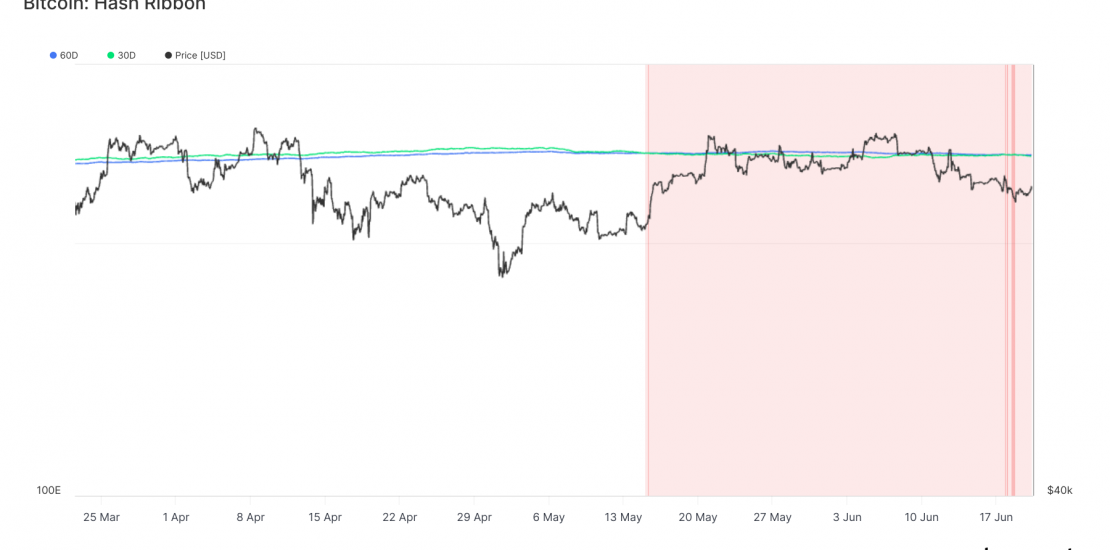 Glassnode data shows that the hash rate, a measure of the processing power dedicated to mining Bitcoin, is striving to return to 600 exahashes per second (eh/s), with the ATH being 655 eh/s on a 7-day moving average (7DMA). Despite ongoing mining capitulation, hash ribbons briefly indicated an end to this capitulation when the 30-day moving average (30DMA) rose above the 60DMA. However, the 30DMA has since dipped below the 60DMA again. This movement suggests the end of the mining capitulation is near.