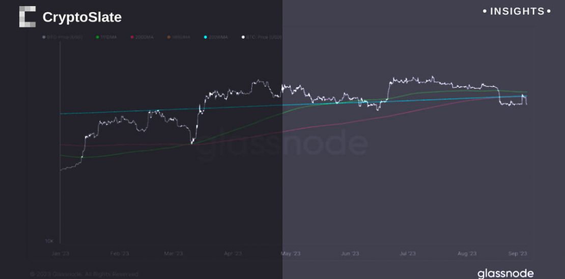 The 111 DMA is a key indicator capturing the short-to-mid-term market momentum, further highlighting the bearish position of Bitcoin. The 200-day moving average, standing at $27,510, and the 200-week moving average, at $27,251, are other benchmarks that Bitcoin currently fails to surpass, reinforcing the bearish condition.