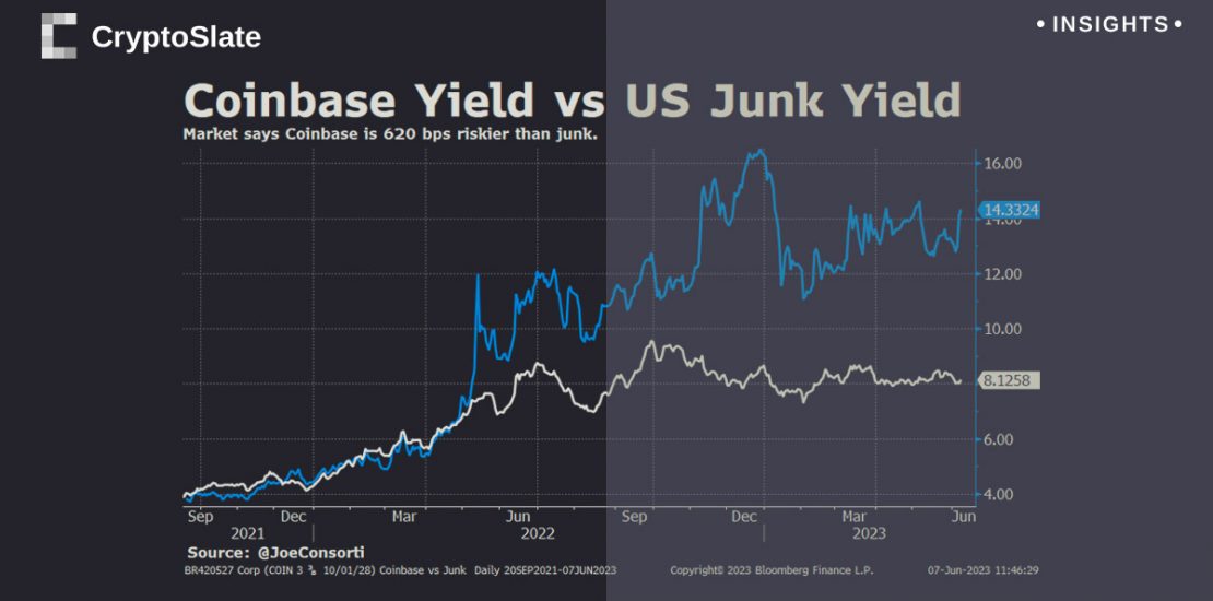 “It yields 14.3% and climbing, which is 1.75x higher than the 8.1% most of America’s junk corporations have to borrow at. The market is saying that Coinbase is 620 bps riskier than junk.”