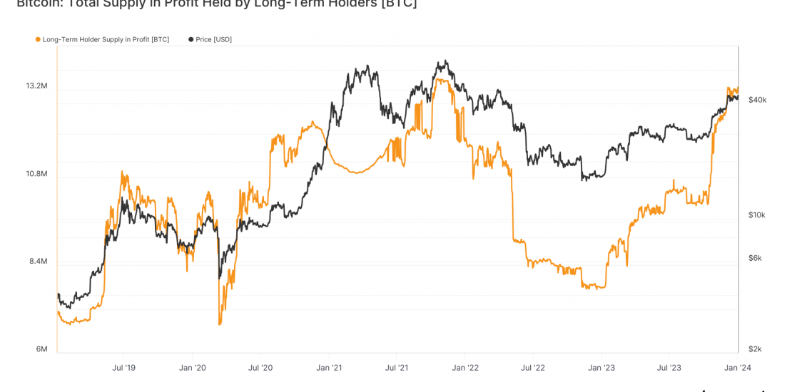 According to recent data analysis, around 14.9 million Bitcoin are held by such long-term investors, roughly 76% of the circulating supply. Out of this figure, approximately 13.3 million BTC are in a profitable position. This marginally falls short of the 2021 peak, which saw 13.5 million BTC in profit when the price was significantly higher at $66,000, in contrast to the current price of $45,000.