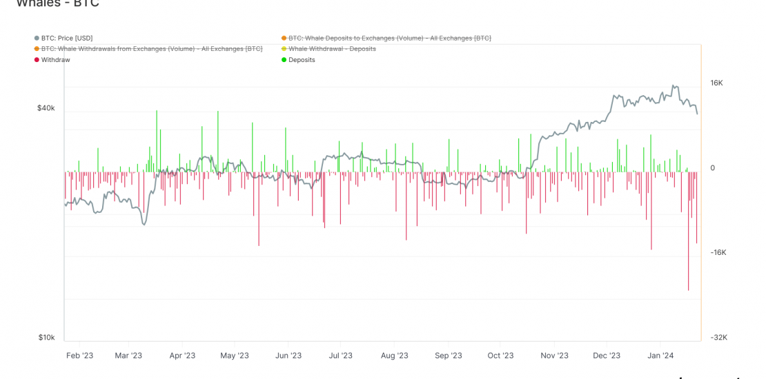 The digital asset landscape is seeing a noteworthy surge in Bitcoin whale activity, as signaled by CryptoSlate’s recent data analysis. Amid a 20% pullback from Bitcoin’s highs, these whales – entities holding 1k BTC or more – appear to be capitalizing on the opportunity to accumulate. A marked uptick in activity reveals a withdrawal of approximately 38k Bitcoin from exchanges, notably surpassing the 24k BTC deposited on Jan. 22. This suggests a penchant for buying, even as the price dips under $40,000.